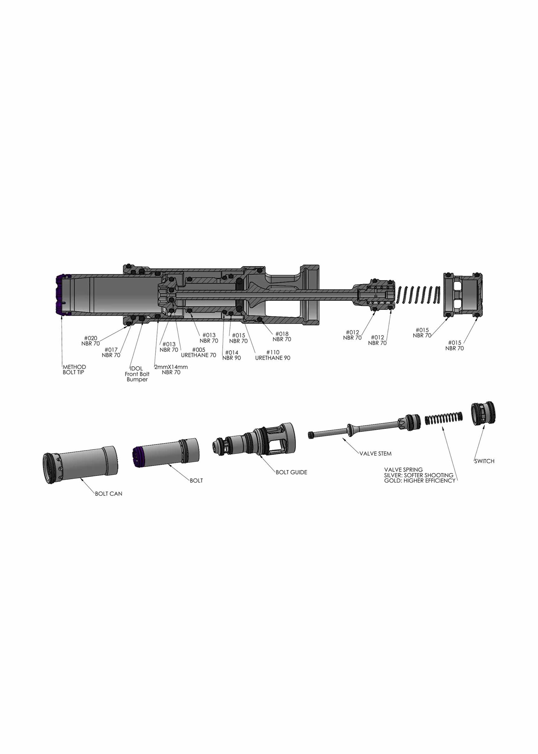 Introducing Methods first Shocker offering! We listened to everyone ask for the IDOL kit to fit into the Shocker Era. Now is the time! This completely new redesigned system comes with a new Bolt Tip, Bolt Guide, Bolt Can, Valve Stem, Valve Switch, and Valve Spring.